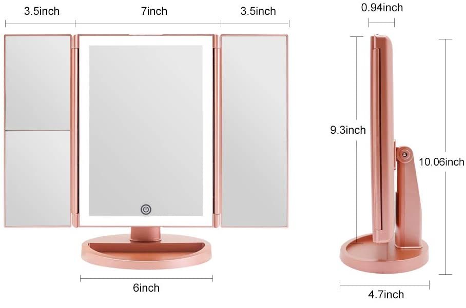 Diseño de tres pliegues (tríptico) y con un soporte que permite una rotación libre vertical de 180 grados, lo que proporciona diferentes ángulos de visión para el mejor maquillaje.